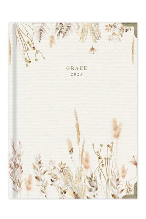 Diary with vintage raised pattern designs on the cover. Hardcover and pointed book corners with gold colour metal corners