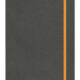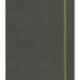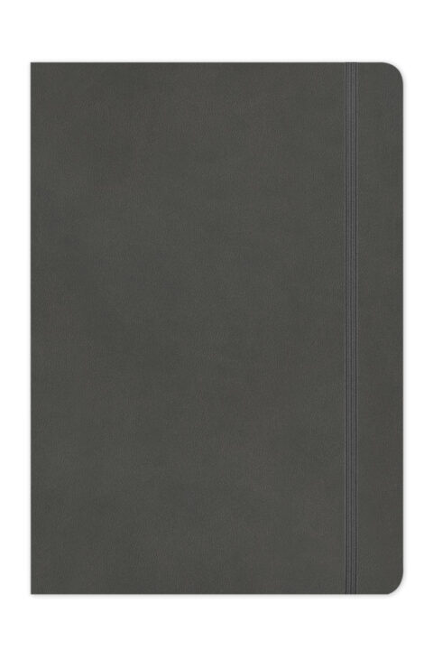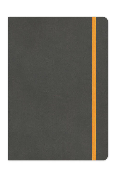 Notebook with hard cover, leather look material and elastic closure in many colours.
